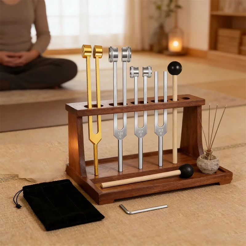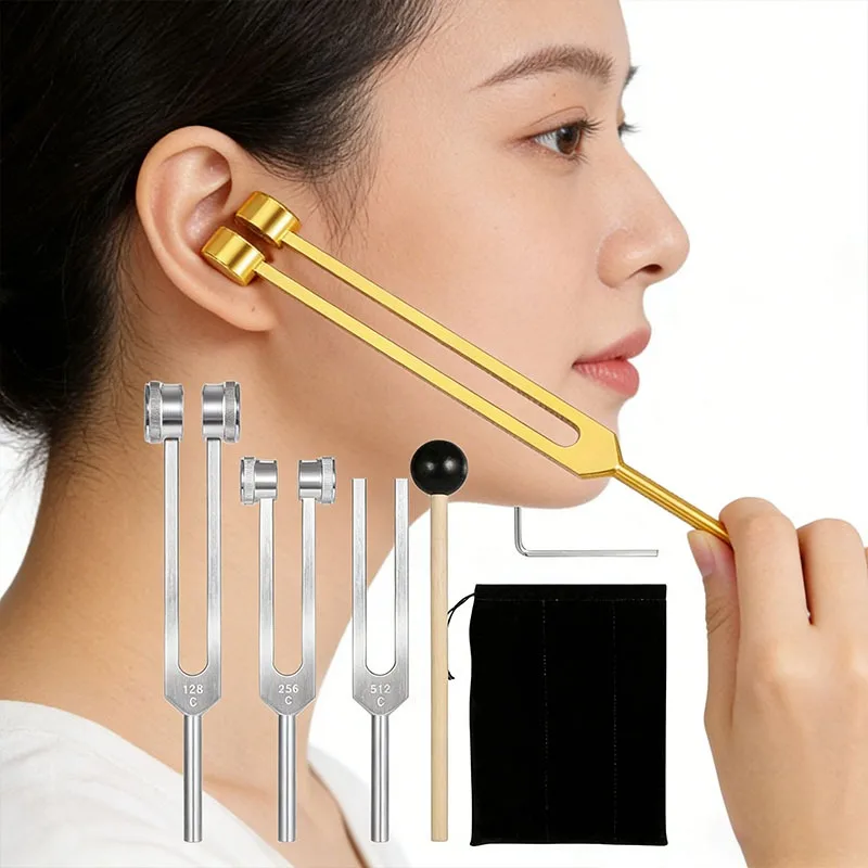 • Ensemble complet avec trois diapasons pour une thérapie personnalisée.